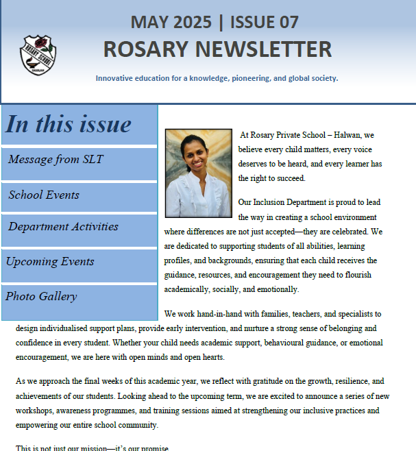 At Rosary Private School - Halwan, we believe every child matters, every voice deserves to be heard, and every leamer has the right to succeed. Our Inclusion Department is proud to lead the way in cr ...